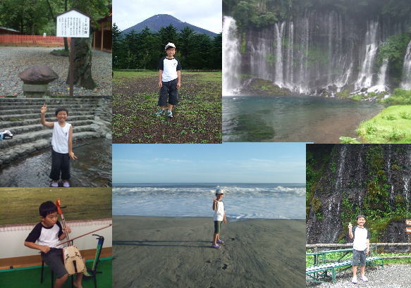 我が家恒例?の日帰り家族旅行へ行って来ました。スケジュールはというと・・・。8日AM2:30出発-富士山(五合目まで)-富士山本宮浅間大社-朝霧高原富士ミルクランド-白糸の滝-清水魚市場「河岸の市」-浜松市楽器博物館-中田島砂丘-帰宅というトンデモスケジュール。まずは富士山から。予想はしていたのですが東名高速では夜中だというのに車が多く、富士宮から富士山スカイラインで水ヶ塚駐車場へ。AM5:50なのに凄い人でした。予定していた時間より30分遅れましたが駐車場からシャトルバスで5合目へ(マイカー規制のため)。5合目で終わりなのは登山初心者なのに日帰り登山は無理だと判断したため。かず君が望めば6合目まで行き、下山するという裏スケジュールもあったのですが結局無し。雲海を見て、富士山の森林限界線付近や昆虫、植物、溶岩を観察し下山しました。その後富士山本宮浅間大社で旅の安全をお願いし、東側にある涌玉池へ。この池の水は富士山の湧水で神田川として市内を流れていきますが、大社の東南にある公園の所で水遊びができます。ただ、水がとても冷たい!水遊びを始めたかず君も出たり入ったりの繰り返しでしたが楽しんでいました。さてお次は白糸の滝へと向かう途中、脇道に逸れて朝霧高原富士ミルクランドへ。ココで動物たちとふれあい、ジェラードを食べ牛乳を飲んで一息。かずくん、未だに牛やロバを撫でる時腰が引け気味・・・。そんなかずくんにもっと撫でてと子牛はかず君の服をハミハミ。そんなハプニングにかず君「うわぁぁぁ、服を食べられちゃう!!」・・・ありえないって。そんな一時の後、白糸の滝へ。音止めの滝から白糸の滝を見て行きましたが、やっぱりかず君。白糸の滝ですかさず沢ガニをゲット。すぐに逃がし、鯉などを見てから岩魚の塩焼きを食べ次へ移動です。いつもなら焼津のおさかな市場へ行くのですが今回はせっかくの遠出だからと清水港へ。こちらで爺婆のおみやげを手配し、お昼ご飯を・・・、と思ったら凄い人。お寿司の折り詰めをかって車の中で食べました。この後は浜松市楽器博物館へ。世界中のいろいろな楽器を見て、聴いて、体験コーナーで演奏してきました。かず君は2年生の時に国語で読んだ「スーホの白い馬」に出てきた馬頭琴を見るのが目的。体験コーナーで馬頭琴をさわりジャンベを叩いたりして楽しみました。最後のお楽しみ、中田島砂丘(この時すでに17時過ぎ)。ここは独身時代の私のお気に入りの場所の一つ。過去、旦那を1回連れてきたことがあるんですがその時から10年。今度は子連れで行きました。ココは海亀が産卵に来る場所でもあり、水辺線が見られる場所でもあります。時間的に丁度満ちてくる時だったようです。波が荒くはありましたが、ココで1時間近くかず君は波と追いかけっこをしたり砂を掘ってみたり・・・。かず君にとって砂浜の海は2度目でしたが(1回目は北陸の松任海浜公園)海と言うだけで無茶苦茶喜んで遊んでいました。私達はというと、シングルバーナーで珈琲を入れて飲みながらまったりとかず君が遊んでいるのを見てました。帰りは高速の渋滞で時間がかかり遅くなりましたがそれでも帰宅予定時刻より1時間ほど遅れてPM10:30に帰ってきました。とりあえず今年の家族旅行は済んだ!!無事帰ってこられたのは嬉しいけれどもう無理は出来ないなと実感。今日は身体が重くて重くてグッタリ・・・(爆。