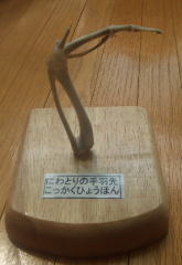 夏休みの宿題「一研究・一作品」はいつも我が家で揉めてます。昨年までは一研究がボツッた時の事を考えて私が一作品を担当してきました。旦那は理科専科なのできちんと研究、実験や結果考察を書かせたい。でもかず君は実験が終わればそれでお終い。この深ぁぁぁぁいミゾのために毎年旦那はかず君を泣かしてしまうのです。泣くかず君を相手に一研究をさせるのはいやになった旦那。とうとう今年は一作品にする事にしました。さて、実際何を作らせようかと考えていましたが昨年、岐阜県博物館で「骨のあるやつ」という催し物をみました。その後、図書館で「ホネホネたんけんたい」、子供の科学(2009年3月号)に骨格標本作り掲載となぜかよく見つけます。もうコレは骨格標本を作るしかないでしょう!!とかず君に聞いてみたところ、「作りたい!!」と返事が返ってきました。手に入りやすさから豚足か手羽先だよね…。とは決まった物の、とりあえずは見本を作らないと…、で私たちが悪戦苦闘。手根骨がどうつくのか調べてもわからないのです。ネットで調べても曖昧で結局パズルのように組み立て接着、骨格標本を作りました。同じようにかず君もトライ。おいしく手羽先をいただいた後、余分な肉と軟骨を取り除き漂白。乾かした後、組み立てです。ですがここで問題発生!!後は骨を組み上げるだけ!という時になって私のパソが壊れたのです。写真の取り込み、印刷をするのに通常私のパソを使っています。あわてて次なるパソを探し設定などで時間をロスしました。ホッとしたのも束の間、骨の組み立て開始。接着剤を付けますがくっつくのに時間がかかるのでグルーガン(ホットボンド)に切り替えてくみ上げていきます。かず君は触らなくても良いところを触り熱傷をしたり、違う場所にくっつけようとし旦那に怒られたり…、といろいろありましたがプラモデル感覚に近いのかそれなりに楽しみながら何とか完成。撮った写真もパソに取り込んで印刷、作成記録を作り仕上げることができました。できた作品はコレ↓。サイズ的には小さな物ですがで結構大変でした。豚足の方が骨が大きい分楽だったかも…。只今、第2弾として豚足をやっておりますがコレは一作品として持って行く事ができるんだろうか…。夏休みも後、11日。ラストスパートです。とりあえず、一作品ができたのでホッとしました。
