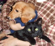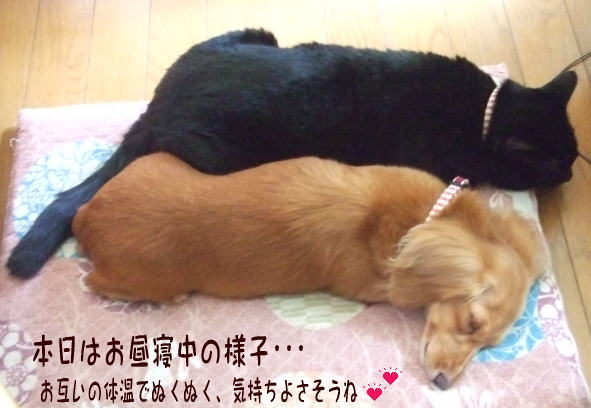 「更紗」が来てからの「ぴのあ」はひと味違います。がを追いかけるのは良くある話ですが、我が家は逆。完璧「更紗」は「ぴのあ」の獲物となっています。ねらいを定めて追いかけ猫パ~ンチ!!。でも「更紗」は上手くかわして尻尾フリフリで無視…。なんかとっても微妙な関係です。もちろん愛情をとられるのは許せない!!とばかりにすっごい甘えてくるようになりました。どこまでこの関係が続くのかなぁ…、なんてポンニャリ考えていたのですが割と早くこんな関係になりました。「ぴのあ」はおちりの匂いをかがれるが嫌で怒るけど、そんなことではめげない「更紗」も凄いと思う。只今「おすわり・ふせ・まて」を訓練中。ついでに「トイレ」もだけどね。でも「トイレ」には時間が掛かりそうな予感…。