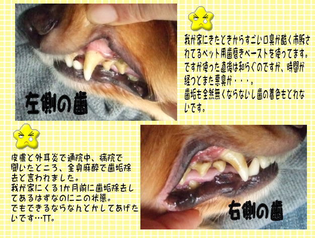ぴのあさんはめっちゃ歯が綺麗です。歯肉もピンクでつやっつや。ですが更紗さんは・・・来た時はもうちょっと色が付いていましたが指にガーゼを巻き付けて嫌がる更紗を押さえつけゴシゴシ・・・。それでもこんな状態なんです。奥歯なんてもっと酷くて本当に我が家に来る前に歯垢除去してもらってきたの~!?状態。我が家の掛かり付け医の獣医さんはあまりやりたくないみたいだし、歯が(口腔が)専門の動物病院なんて近くにないです。そこで文明の利器でもある目の前の箱で検索してみました。いろんなペット用マウスクリーナーがありましたが候補を2つまで絞りました。一つは「ビルバック C.E.T歯磨きペースト」もう一つは「ペッツライフ オーラルケアジェル」です。更紗の口の中を見ると「Oh,NO」と言うくらい汚いし臭い。臭いどころか悪臭です。こんな状態に良いのはどちらなの?ビルバックの方は歯垢除去した後、または軽い状態であれば良いのかもしれない、と思いました。ペットの嗜好性も良いみたいだし。ペッツライフの方は説明のように本当にこんなに綺麗になるのかわからない。でも決め手は検索したブログ内に「塗り続けマッサージしていたら歯垢がポロッととれてきた」とか「柔らかそうだったからピックでコリコリしたらとれてきた」という体験談があったこと。7200円はとってもとっても懐が痛いけれど、全身麻酔の歯垢除去だといくらかかるか・・・。それを考えると安い買い物?とりあえず旦那と相談し、結果ポチリました。待つこと数日。届きました~。購入時、レビューを参考にペパーミントを選んだのですが結構匂いがきつい?サーモンは魚臭いと書かれていたので避けたのですがぺパーミントも結構・・・だと思う。早速更紗の歯磨きをしましたがこのボトル、レビューにも書いてありましたが凄く使いにくい。一人で素早く終わらそうと思うと難しいです。こんな使えないボトルなら別容器に移して使わないと歯磨き自体が面倒になってしまい悪循環になりそう。更紗はというと、匂いなのか何なのかわかりませんが、とにかくすっごく嫌がりました。今まで使っていた物の方がまだ抵抗が少ないです。しばらく朝晩は更紗と格闘ですね。どうなるかわかりませんがオーラルケアジェルを使用し、更紗の歯がどう変わったか(変わらないかもだけど)、経過を書いていきたいと思います。