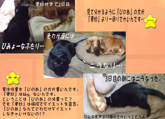 先週は雪が降りました。その後、風がとても冷たく強くなりようやく冬到来って感じですね。さて、我が家のペットたちは寒いとストーブの前が定位置です。なかなかどきません・・・。また甘えてきたどちらかを抱っこするともう一匹が「あたちも!あたちも!!」と抱っこをせがむという状態にいささかグッタリしております。はっきり言って2匹で5kg越えてます(実際は7kg越え)20分も抱っこしていると腕は痺れ肩こりになります。でも抱っこして欲しいのね。キッチンと居間の境には更紗が入ってこれないように柵があります。ぴのあは飛び越えてこれるのでご飯の準備をしていてもそばに来て「だっご~ だっご~」と大騒ぎします。すると柵を越えられない更紗は何を思ってか居間を歩き回り「あたちはココにいるのよ!」とアピール・・・。どっちも可愛がっているつもりなんだけれど足りないのかな?そんな更紗、名前を呼ぶとこんな顔します。ちょっと顔をかしげて「何ですか?」って感じ。ぴのあだと顔を向け目を細めるだけ(ご機嫌だとお返事してくれる)。なのでなんかとっても新鮮。写真に撮って気づいたのですが、我が家に来た時と比べ胸の毛が増えてます。もちろん毛艶も良くなっています。一番貧弱でダックスぽく無かった尻尾も少しずつ長い毛が出てきました。やっとダックスらしくなってきた・・・、と言うところですかね。子犬ではないんだけど・・・。動物で宣告されたダイエットも何とか上手くいき只今3.5kgです。もう少し落とせると良いのかもしれないけれど今のところ、コレで良しとしています。餌を変えたら皮膚の状態は良くなってきましたし、外耳炎もとりあえずは完治・・・かな?(まだ点耳薬が残っているので使い切ったら再度病院です。)残るは口の中だけですが、コレはまた後日書こうと思います。そして今の更紗はと言うと・・・ストーブの前をぴのあにとられ毛布の上でZZZ・・・しています。顔にちょっとムカツキが出ているかも・・・。でもぴのあも更紗も毛布大好きなんですよ