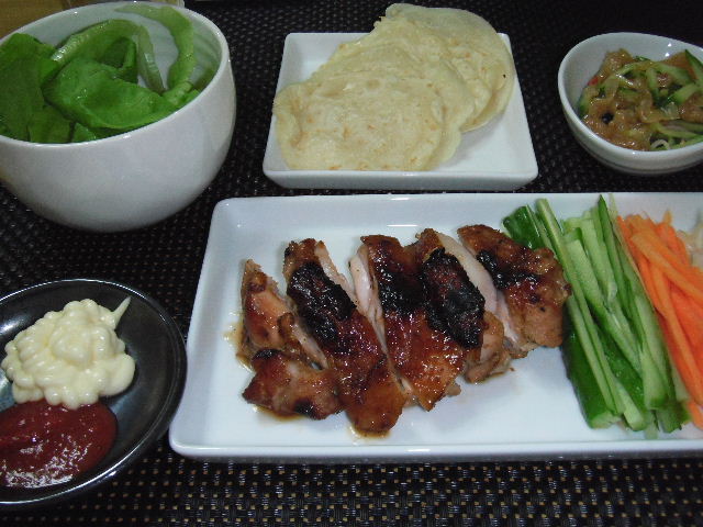 鶏肉をよく使うのですが・・・いつもと違ったメニューをとクックパットで検索して今夜のばんごはんは なんちゃって北京ダック 参考にしたレシピ 北京ダック風!なんちゃって北京ダック 鶏肉だけど北京ダック 甜面醤が無かったので豆板醤とマヨネーズでいただきました カオヤー餅(ぴん) 北京ダックスライス 10P13Oct09