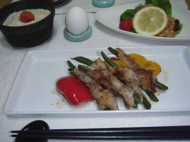こんばんは今日は主人も息子も帰りが遅い私はお風呂も入ってですっかり出来上がっちゃいました昨日のばんごはんは豚肉のいんげん巻めかじきのバター焼主人のお気に入りのお豆腐のムース今日は明太子をのせてごま油とお醤油でゆで卵