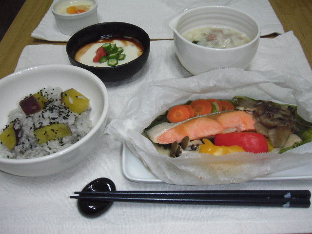 今日は朝からでも、また明日からずっとの予報も来そうですね仕事帰りに買い物しなくていいように買いこんで来ました 昨日のばんごはんは蒸し鮭 さつまいもご飯 これ 美味しいですワンタンスープお豆腐のムース