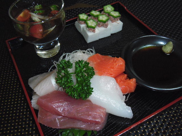 今日は朝から で主人は午前中からお昼ごはんも食べずに庭の草むしりを頑張りましためずらし~ 明日は嵐が来るかも・・・でも、ここは持ち上げておこうといつもより多めにを用意また、頑張ってね~ 「お父さん」 昨日のばんごはんは お刺身 もずくはんぺんのマヨコンビーフ&おくらのっけ 毎日お刺身だと楽ですね