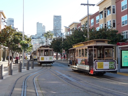 サンフランシスコ名物のケーブルカーにはPowell-Hyde LinePowell-Mason LineCalifornia Lineの3路線があります。週末のPowell-Hyde Lineはかなり混雑していると聞いていたので、まずはPowell-Mason Lineの一番海側の停留所を目指しました。Taylor St.とBay St.の交差点にあります。あまり混んでおらず、スムーズに乗ることができました。乗車1回につき5ドルですが、muni PASSPORT(1day-Pass)を持っていたので、提示するだけでOK。 路線図http://www.cablecarmuseum.org/ride.htmlケーブルカーの客席の後ろ半分は室内にあり、前半分はベンチ式のオープンスペースになっています。ベンチの外側にはステップがあり、座席が埋まるとそのステップに立って乗ります。両側にあるベンチシートの間、すなわち車両の中央には操縦用のレバーがあり、運転手が操作しています。どういう仕組みで運転しているのかよくわかりませんでしたが、次に行くケーブルカー博物館で知ることができました。ケーブルカー博物館(Cable Car Museum)は各路線のちょうど中間地点にあります。入場は無料です。ここではケーブルカーの歴史や動く仕組みが紹介されています。ショップもあります。館内のちょうど中央部にはいくつかのモーターがあり、ケーブルを駆動しています。このケーブルが各路線の道路の下に埋まっており、ケーブルカーはそのケーブルを掴んで走るというのが仕組みということが分りました。さきほど紹介した操縦用のレバーでケーブルをつかんだり放したりしているようです。このケーブルカー博物館は単なる博物館ではなく、心臓部でもあるのです。◆サンフランシスコケーブルカーの駆動源(YouTube)http://www.youtube.com/watch?v=2GrQJy8rY1gちょうど博物館から出ると、人気路線Powell-Hyde Lineのケーブルカーがやってきました。最前列のステップが空いていたので、すかさず乗車。はじめてのステップ乗車!海岸方面に向かいます。気をつけないと、路上駐車のクルマにぶつかりそう。そんな様子を動画はこちら。◆サンフランシスコケーブルカーでステップ乗車1(YouTube)http://www.youtube.com/watch?v=7vVAkry7sMI下り坂ではケーブルを放し、重力とブレーキで制御しながら下ります。◆サンフランシスコケーブルカーでステップ乗車2(YouTube)http://www.youtube.com/watch?v=W5cbAtwR4Hw終着のBeach St.に到着。Market St.方面に向かうケーブルカーの乗車待ちは大行列。なので、ふたたびTaylor St.とBay St.の交差点にあるPowell-Mason Lineの停留所まで歩きました。やはり、こちらの順番待ちはほどんどなくすぐに乗車できました。Beach St.(Powell-Hyde Line) Bay St.(Powell-Mason Line)待っているときに進行方向の転換の様子を動画撮影。ケーブルによる駆動力で加速したのち、惰性でターンテーブルまで。そして、ブレーキ。テーブルは人力で回転させます。◆サンフランシスコケーブルカーの方向転換(YouTube)http://www.youtube.com/watch?v=v11z438lO0Uそして、再度Powell-Mason Lineに乗って、ユニオン・スクエアまで戻り、その後メンバーたちと合流。夕食はユニオンスクエアそばのレストランでいただくことに。すっかり夜になりましたが、折角1day-Passを持っていたので、夜のケーブルカーを堪能しようと、人気のPowell-Hyde Lineに。さすがに夜だったので待たずに乗ることができました。夜のケーブルカーもなかなか趣深かったのですが、3月初めということもあり、ほろ酔いで睡魔が襲ってくる中、寒空のベンチシートは少々きつかったですが、合計4回とサンフランシスコのケーブルカーを十分堪能できました。地球を楽しんだ旅の記録 かっきぃーの旅行記 たとえば 砂漠のオアシス 灼熱のドバイたとえば 冬の中国シルクロードたとえば 短期間集中型!沖縄那覇観光たとえば 紀伊半島ぐるり(原チャリで行く1)