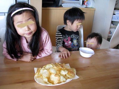 今日の子ども達のおやつは、ポテトチップス。買い物に行ったらジャガイモが安かったので、スライスをして作ってあげました。うちではフライドポテトよりもチップスの方が人気が有ります。自分で作れば無添加なので安心ですね。三人であっという間になくなりました午後からはベーカリーで食パンを作りました。強力粉が無かったので、薄力粉で作りましたが中はしっとりして味もでした。 最後に今日の次男。一生懸命仮面ライダーの本を読んでいます。長男と一緒で「仮面ライダーや戦隊ヒーロー」が大好きなので、けっこう乱暴者です・・・