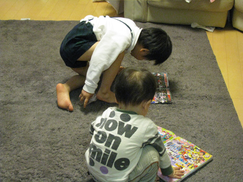 こんにゃくゼリーの窒息事故により、ニュースでも「回収・製造中しか?」など出ていましたが、度重なる事故ってけっこう多いですよね例えばお餅を喉に詰まらせて亡くなってしまう方や夏は水難事故。多分当事者になってしまった方は、少なからず以前の事故については知っていてまさか自分が・・・という事の繰り返しなのかな自分自身も気をつけないと、いつ事故に巻き込まれるか心配ですね。常に「やっとけば良かった」ではなく「やっておいて良かった」と思える行動を意識したいと思います。 いつも本を取り合う元気な2人が珍しく喧嘩せず並んで本を見ていたので写真を取りました。この2人はたくましくなりそうです。 アクセスが8000を超えましたブログをはじめてここまで続くか自信が無かったのですが、読んでいただける皆様のおかげでずっと続けられそうです。ここで出会えた皆さんに感謝します。本当にありがとうございます、これからもよろしくお願いします。