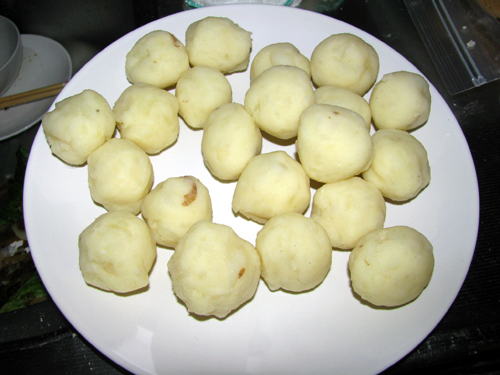先日頂いたじゃがいもがまだ沢山あるので「じゃがいもモチモチ揚げ」?なるものを作りました。ジャガイモを柔らかく蒸してからすり潰して、片栗粉と塩を混ぜて丸くまとめます。形や大きさの違いなんて気にしない気にしない・・・中火で外がきつね色になるまで揚げるだけ。油が少なかったので、入れる直前に少し平べったくしました。外はカリカリ、中はモチモチで想像以上に美味しく出来ました。今回はケチャップで子どもたちが喜ぶようにしましたが、ペッパー系で作ればビールのおつまみに良いかもしれません。