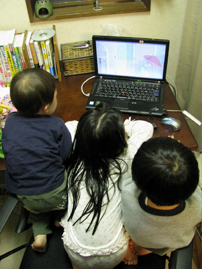 昨日近所のヤマダ電機へ行った時に、真ん中に子どもたちが遊べるスペースが有るのですが、買い物を終わって戻ると3人揃って「スティッチ」を真剣に観ていました。他の子ども達は置いてあったおもちゃで遊んだりしていたのですが3人は興味なし・・・兄弟ってやっぱり似るんですね。