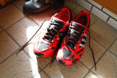 3月23日に40歳になったのですが、今年は震災の影響も有りそれどころでは有りませんでした(^-^;プレゼント何がいい?と言われていてずっと考えていたのですが、今日仕事で栃木へ行った合間を見て佐野のアウトレットへ行き、シューズをプレゼントとして購入させてもらいました写真ではオレンジっぽく見えますが実際は真っ赤です。ゴアテックスなので、通気性は良く外部からの水が入りにくくなっています 何気に40年で一番色使いが派手かも(^-^;