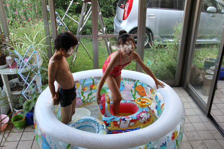水曜日から夏バテをしてしまい、木金と寝込んでいました毎週の様にサッカーやドッジボールなどが有ったのでオーバーワークになってしまった様です。もう若くない証拠ですね(^-^;水曜日に立ちくらみが有り、その後はだるさと関節の痛みがあって熱は無いものの立っているのがしんどかったです。エアコンをつけて水分を摂り、しっかり睡眠もとったので昨日の夜にはほぼいつもの状態に戻りました。ニュースでは毎日の様に救急車で搬送されている人がいる様なので、他人事と思わずこれからも対策はしっかりしないといけませんね。 そんな暑さの中でも子どもたちは元気いっぱいです 特に長男は元気が有り余っている様で、今日も午前中にドッジボールのクラブチームの練習に参加して、家ではプールで飛び跳ねています 準備OK!せーのっじゃ~んぷっっとちゃ~くすい!それにしても水戸は一回大きな雷雨があってからは全く雨が降ってません。。。雷雨じゃなくていいから少し雨降ってくれないかなぁ。