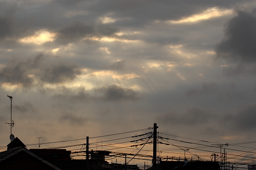 今朝は少しひんやりしてます。 昨日の夜も千波湖へジョギングへ行きましたが、思った以上に肌寒かったです。まだまだ気温差には注意しないといけませんね。 先ほど外を見たらどんより雲の隙間から光のカーテンが見えたのですが、普通に見るとあまりはっきり見えなかったので、RAWで撮影してレタッチしてみました。 ほぼそのまま 色温度とコントラストをぐっと変えて少し幻想的になったかな 皆さんにとって良い一日となりますように