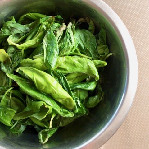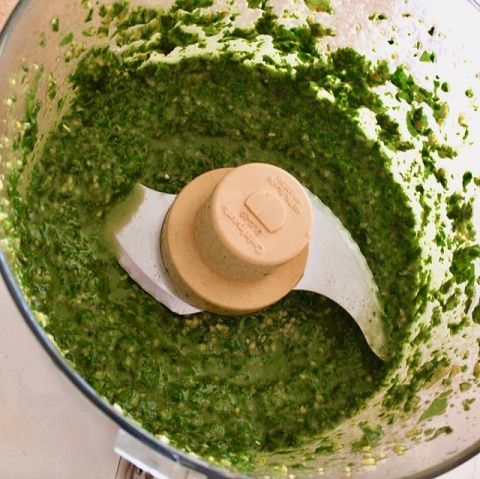 バジルの葉50g、松の実20g、アンチョビ10g、にんにく1片をフードプロセッサーにかける。オリーブオイル100ml、塩少々を加え更に回してペースト状にする。