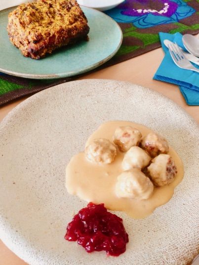 手前のスウェディッシュミートボールがのっている白いお皿と