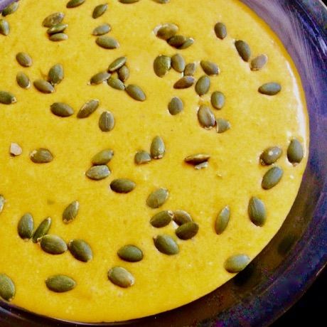 (4)型にバターを塗ったところに流し入れ、かぼちゃの種適量を散らす