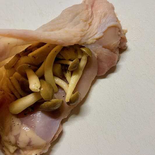 皮をめくってきのこを入れ、楊枝で止めて焼きます。