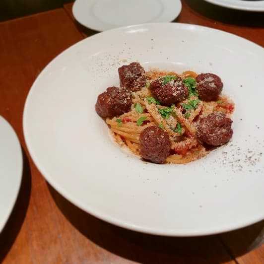 シェフのオリジナルパスタ、スパゲットーネのミートボール。