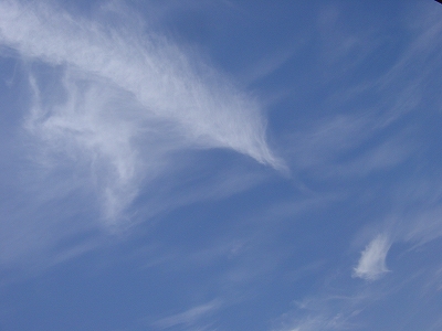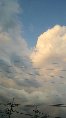 今日の空はワンダフル東の空が夕焼け雲でオレンジだったので見上げたら、西から天気図の前線みたいに雲がぐんぐんやってきてあっという間に暗くなって、そして過ぎていった。で、超きれいな青空と夕焼け雲に戻って感動したんだ北の方には雲が低くたれこめてきっと雨が降ってるなぁ。。っていう暗い雲の色じっと見てたら稲光が見えてキレイなゴールド!それからやっぱり虹が縦に広がってさぁーっと消えたそのあとしばらくその低い雲は中でフラッシュたいたみたいに光ってたこっちはぜんぜん晴れてて明るいのにパラパラと雨が飛んできてなんだかうれしかったなカラスもツバメもモンシロチョウもあわてて飛んで帰ったよ風が強い日は楽しいなぁ↑右へ行く雲と左へ行く雲もうすぐ夏だねkeico♪