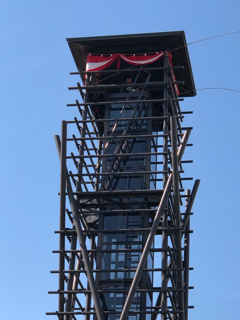 呼び出しさんが櫓の上で太鼓を叩いています。