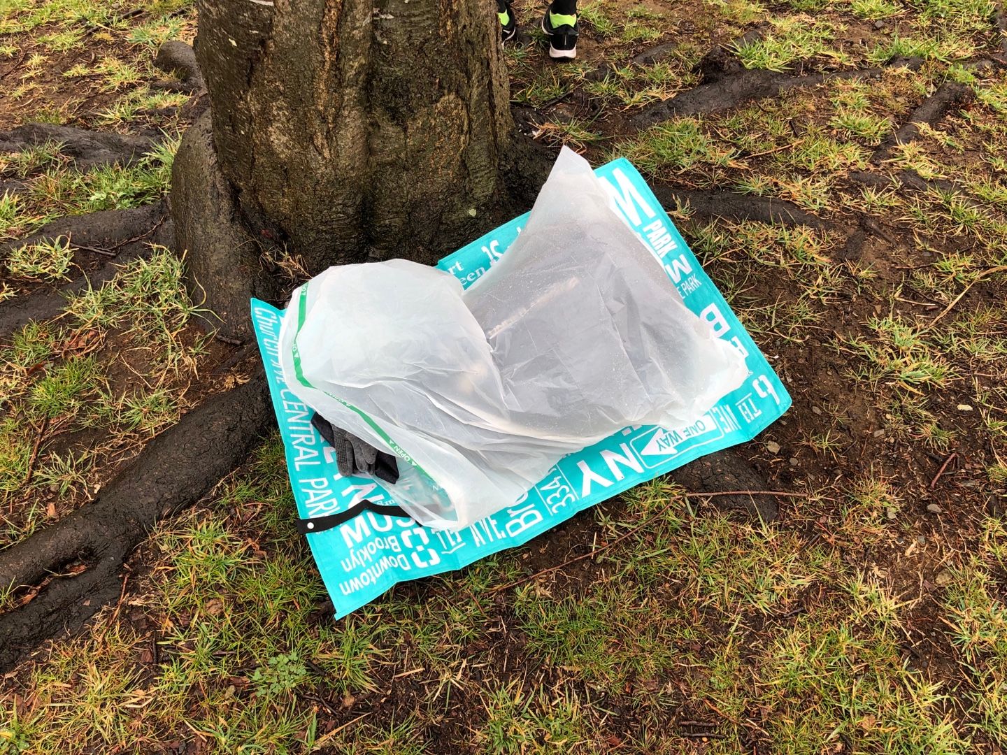 ゴミ袋を準備していたので、木の根元にシートを敷いて、リュックはゴミ袋にしまいます。