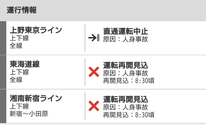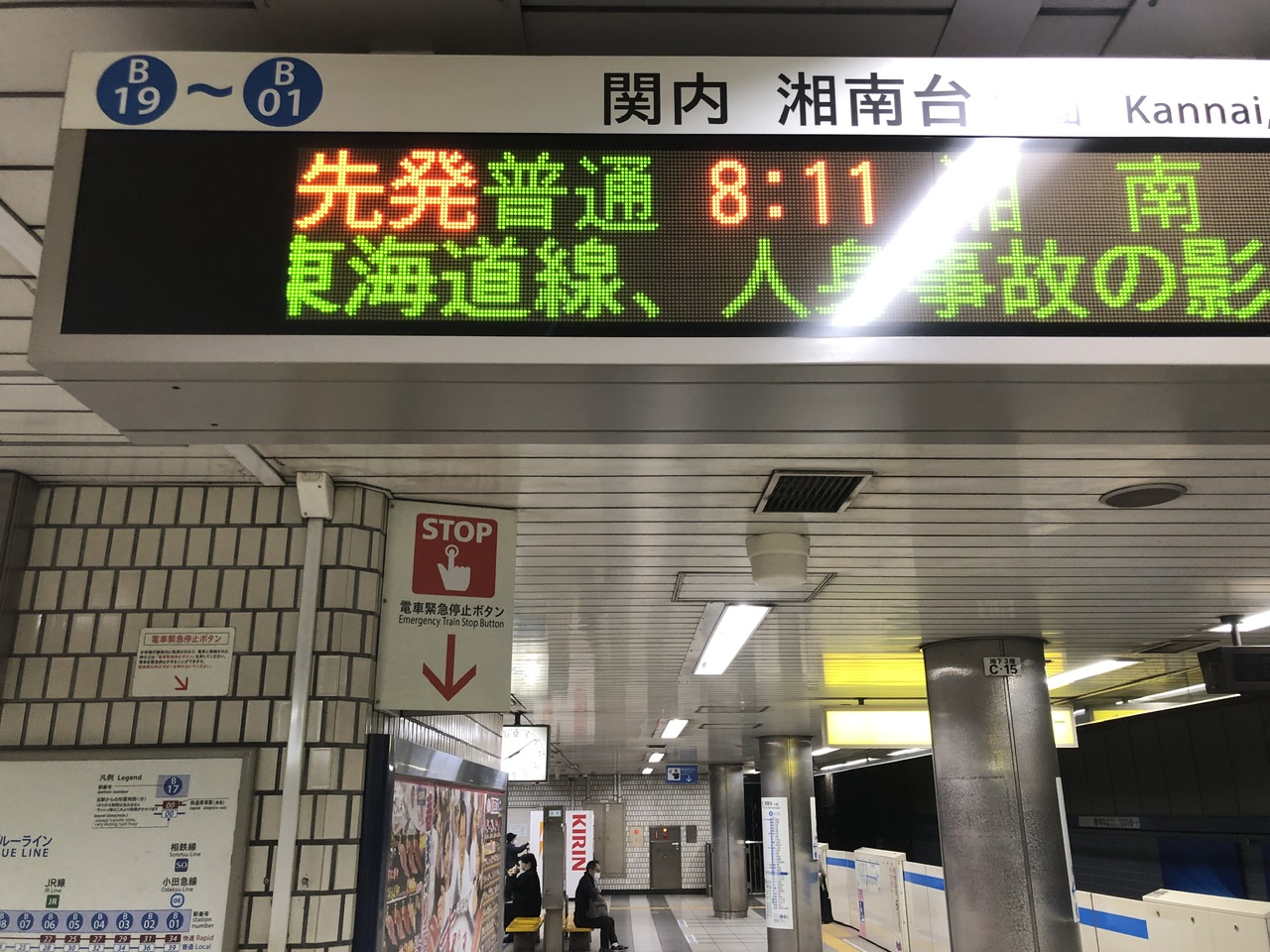 すると、横浜駅到着の少し前の車内アナウンスで、JR東海道線が人身事故で止まっている、という連絡を耳にしました。