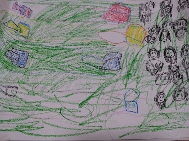 今日、会社から帰ったら、娘が幼稚園で書いてきた絵が置いてありました。最初は何の絵かよくわからなかったのですが、よく見ると、どうやら先日の運動会の様子を書いたみたいです。一つは、大玉運びリレー競争スタート前なのでしょうか、お友達がみんな並んでいるようです。身体が書かれていませんが、娘にしてはよく書けています。それから、ダンスカラフルなボンボンを持ってじょうずに踊れました。ぬりえだけではなく、ちゃんと絵が描けるようになってきました。色使いや表現が少しずつ豊かになってきています。子どもの進歩にちょっとだけ刺激を受けたパパでした。(パパも進歩しなければ。。。)
