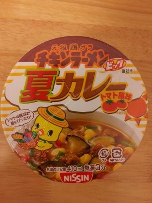 今日は、久しぶりのコンビニ(セブン)ネタです。 今までどおり、セブンには通っているのですが、最近、新ネタものを買っていないので、書けずにいました。今日は、 NISSIN「チキンラーメン 夏カレー(トマト風味)」(195円、516Kcal)を買ってみました。パッケージには、「トマトの酸味が夏にぴったり!」と書かれています。 私の好きな鶏ガラで、味もさっぱりした感じで美味しかったです。