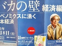 先日、養老孟司さんのお話を聴く機会がありました。無料の講演で、お題は、「バカの壁 経済編 アベノミクスに湧く日本経済」と題したものでした。【送料無料】バカの壁 [ 養老孟司 ]価格:714円(税込、送料込)「バカの壁」、私はまだ読んでいませんので、書籍との関係はわかりませんが、解剖学を専門とする先生が、経済の話ということで、興味深く聴かせていただきました。ご自身の経験やご専門である解剖学の話などを交えながら、聴きやすく、わかり易く講演されていました。新たな視点、気付きを与えてくれる講演で、とても充実した時間を過ごせました。