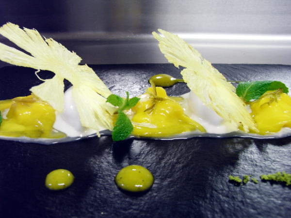 マンゴーは薄く切り、それをラビオリの皮のように使用します。ラビオリの具は、甘いパイナップルを、ココナッツクリームと合えたものを中にしのばせ、ラビオリの上には、ライムのコンフィが乗ります。