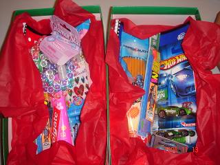 Today I and my mom made 2 Chrictmas gift's boxs to Samaritans' kids.This is a project of Samaritan's Purse. One is for Boy 5 to 9 years old.And the other is for Girl 5 to 9 yeard old.I think they will like them.The Samaria is lot of battles. When I heard about this I was very shocked.So we will give them presents for Chrictmas. I hope the Samaria get to piace soon.