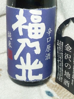石川県 金沢市 福乃光・辛口原酒・純米 株式会社 福光屋 使用米不明 精米歩合70% 日本酒度+5 酸度2.5 アルコール度18 購入価格:678円(848円の商品入れ替え20%引)ほぉ・・・・、旨味にあふれる重めの味わい。胚芽米のお粥っぽい香り。味は ただ甘いだけじゃなくて酸味やダシ汁っぽい感覚が有って面白い。なかなか“酒”の感覚が明確で飲み応えが有る。ほんのり粘性を感じる酸味と旨味とがコクを出す。余韻の出方や苦味の感じ方はやや荒っぽいが、それは原酒ならではの物と思う。良くも悪くも大雑把な味の出方だけれど、それはそれで特徴の範囲内の話。総合的には高汎用の日本酒。飲み方は冷や から 熱燗 まで何にでも対応可能。熱燗にしてアルコール分をある程度飛ばした場合、御吸い物みたいで味わい深い。これは「おでん」なんかが大ハマリしそうな味。酒の旨味の出力が鍋物系のスープの味に負けてない。その分、白身魚の刺身や冷奴豆腐みたいな 繊細な味のツマミには合わなそう。678円なら値段以上。848円でもこれはお買い得と思う。原酒らしいから飲み方の自由度も広そうだし、下手な1000円クラスの日本酒よりも良い働きをしそう。