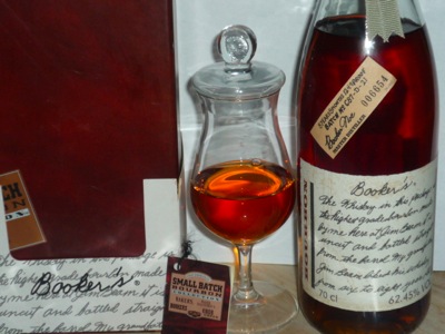 ちょっと珍しい紙箱バージョン アメリカ ケンタッキー州 ブッカーズ Booker's ジム・ビーム・ディスティリング社 フレッド・ノオ氏 Jim Beam Distilling Co. グレーン、モルト スモールバッチ樽熟成8年8ヶ月(Batch No.C87-D-21)(ボトルNo.006654) アルコール度62.45%(124.9PROOF) 輸入:有限会社ウイック 購入価格:3120円(700ml)(6240円の商品入れ替え50%off)香りはバニラ、檜、バナナ、メープルシロップ、コーヒー、黒糖?一瞬、消毒薬っぽい強いアルコール臭が有ったが、すぐに消えて甘い香りが昇る。整頓された綺麗さを持ちながらも、なかなか芯のあるタフな香り。【ストレート】香りの割りに意外と甘味が弱く、やや無機的で面白みに欠ける。60%超というアルコール度にもかかわらず、喉越しは思ったよりソフトで結構綺麗。その代わりか余韻にスモーキーなニュアンスが立ち込め、穏やかではあるが苦みが多めに拡がる。味自体の主張はそれ程でもないが 香りと余韻の伸びの印象は悪くなく、なかなか大人の味。【ロック】うわっ、何だコレ!? 味が塩ょっぱい。香りはちょっとチョコレートっぽい感じだったが、冷えて味が締まり過ぎたのか、苦みとクセが強烈に出てる。【ストレート】時のと同じバーボンって感じがしない。氷が溶けて落ち着いたら、いくらか塩気も収まるが、そこに美味さがあるとも感じない。面白さは有ったが、積極的に飲みたい味でもないな。【水割り】割り水はサントリーの「南アルプス天然水」 ・酒1:水0.1口通り・喉越しがピリピリと荒れ、【ストレート】時の穏やかさの長所が揺らぎ気味。ある意味飲み応えは生まれたのかもしれないが、それが美味さに繋がってるとも思えない。これはイマイチ。 ・酒1:水1香りがノッペリした感じに。でも味は甘味が感じられる様になり、飲み易さ と 美味さ はもう少し分かり易く。1分弱位の時間経過で馴染んでくると 香りはそこそこ復活し、木のニュアンスが強めに出るが バーボンらしい存在感を盛り返す。ただ 香りの高級感はやや落ち、標準レベルのバーボンと大差無くなってるかも。 ・酒1:水3~4透明感の有る甘味を感じ、香りもあまりうるさくない。余韻の苦みが少々伸びるが、これは甘味の引き立て役要因。これは結構クリアーで美味いな。オススメは【ストレート】か【水割り(酒1:水3~4)】バーボン好きならストレートだろうが、初心者なら薄めの水割りで十分美味いと思う。【ロック】はユニーク過ぎて かなり人を選ぶ。味が中途半端なトマトジュースみたいにグシャグシャに潰れてる感じ。香りは上手い事絞られたっぽかったが、味があらぬ方向に行ってしまった。香りの質と味の佇まいは 一定の高級感を感じられた。味も独特の個性と厚みがあり、このウィスキーの良さと特徴は何とか理解したつもりだが、美味いと賞賛するには1~2手足りないものを感じる。これは酒の個人的な好みに左右されてる部分だろうか!?このバーボンはもう、完全にバーボンが好きな人向けの酒だな。自分が飲む分にはメーカーズ・マークやノヴ・クリークで十分。多分バーボンファンにとっても、ブッカーズは上級者向けと思える。薄めの水割りなら万人向けだろうが、それならこのバーボンでなくてもいい感じ。3120円なら値段以上。バーボンは苦手な部類のウィスキーで不慣れな部分もあるが、ウリとターゲットが明確な分4600~5250円辺りまでなら納得。バーで1杯50mlで、1500円~1800円位なら、好きな人なら注文するだろうなと思える。通常6000円オーバーはちょっとやり過ぎかもw。120ml程飲んで、3日後。(再栓して気温21℃位の部屋に保管)香りはバニラやメープルの香りが強まり、コーヒーやバナナの要素は後退。これはそれ程大きな影響は無し。【ストレート】独特の粘性が軽くなり、サラッとした口当たりに。苦味や余韻の圧力も同時に軽くなってて、開栓直後のボリューム感は微妙に後退。でも飲み易さが増したとも感じられ、これはこれでそんなに悪くない。【ロック】砂糖入りのウーロン茶みたいな香りに。でも味は初日のトマトジュースみたいな感じが薄れ、より万人向けのバーボンロックに。余韻は途切れ途切れだが【ストレート】時よりももっとソフトになり、飲み易さは向上。【水割り】基本は【ロック】時の延長線上の味。水の量が増えるごとにウーロン茶(伊藤園の「金の烏龍茶」)に近い味と香りになっていく。バーボンとしての面白さではないのだろうが、酒としての面白さは感じられた。抜栓後に日数が経つと 高汎用の結構分かり易い酒になるな。初日よりも良い意味で重厚さが薄れ、比較的取っ付き易い印象に変わった。バーボン好きなら【ストレート】のままで良いし、【ロック】で飲めば万人向け。【水割り】は水の量次第で飲み手に合わせた個性のコントロールが可能。まあでも、バーボンが好きな人で人でなければ買わなくてもいいだろう。高品質なウィスキーなのはよく分かるし、美味いことは美味いが、価格以上の驚きや喜びが得られるものではない。