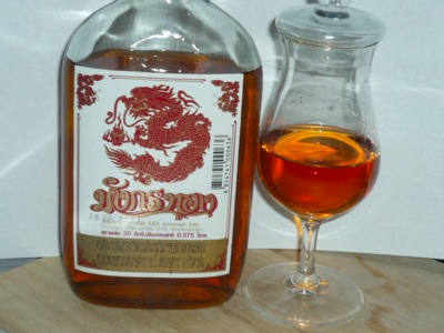 もらいもの タイ旅行土産 マン・コン・トーンとは「金色の龍」という意味らしい本来は名前の間に「・」は付かないが、公序良俗に反する単語が含まれてるという警告が出てw投稿出来なかった。タイのウィスキーというのは、ウィスキーとは名ばかりで、往々にして米焼酎にカラメルで色付けしたものがほとんどらしい。一応本物のウィスキーの様な風味や香りはするのだが、そこはどうしても人工的なニュアンスが離れない。まさにこれは「タイ・ウィスキー」という一つのジャンル。 タイ・ウィスキー(焼酎?) マン・コン・トーン MangKonThoong 作り手不明 もち米使用 アルコール度35% 参考価格:不明(百数十バーツらしいので、日本円で400円前後?)(375ml)香りはペパーミント、黒蜜、カラメル、シナモン、バニラ?最初のツンとくるアルコール臭を抜けると、(やや わざとらしいが)甘い香りが昇る。【ストレート】味は大分希薄かな。香りの力のおかげか、やや甘いニュアンスは感じられる。余韻はノッペリしてて、苦味と甘味が薄く伸びる。それなりに飲み易いし 不味くはないけど、飲んでて面白くはない。【ロック】冷えて味が締まったのか、いくらかクリアーな味わいに。飲み易さは増した感じだが、余韻の苦味が より平坦に口内に広がってくる。口当たりは意外と綺麗なのに、飲んだ後がイマイチ綺麗にならない。【水割り】 ・酒1:水0.1大筋では【ストレート】で飲むのと大差無し。でもミント系ガムっぽい甘味が目立つ様になり、ちょっぴり爽やかさを主張。香りが甘味を支えて、余韻の苦味をソフトに抑えてる。 ・酒1:水1おや?香りが一気にしぼんじゃった。このままだと、ただの甘苦い水に近い。これはこれで普通に飲めるけど、個性を支えてた香りが弱まると、味も無個性に偏っていく。 ・酒1:水3~4これはダメだな。香りが消し飛んで、ただの怪しげな酒入りの水になった。デルカップの薄め水割りっぽい感じ。(←デルカップに関しては分かる人だけ分かってちょうだいw)何だか、飲んでて一長一短が顕著。良い部分は有るんだけど、悪い部分も同じだけ有って、味の決め手がハッキリしなくなる。どんな飲み方でも印象がブレないのは、これはこれで面白さとも言えるか。オススメは【ロック】か【水割り(酒1:水0.1)】。冷えたソーダで割るか、ライムでも絞って薄めの水割りにすればそこそこ面白くなりそう。少なくとも【ストレート】で飲んで美味しい酒ではないな。水割りでも、氷入りできちんと冷やして飲めれば 結構悪くない。デルカップを連想して腑に落ちたが、甘味の質や出方が薬酒っぽい感じ。ウィスキーとも焼酎ともつかない独特の甘味が、良くも悪くも個性を生んでる。ウィスキーと言うよりは、甘ったるさのある泡盛か。甘味の感じ方に人工的なものを感じるが、そこに抵抗を感じなければ比較的万人向けの酒になれる。氷でキリッと冷やして水やら何かで割れば、ガブ飲みもイケる。やはりタイ料理とは相性良いと思う。甘い香りと味わいから、酸っぱ辛い料理に向いてる。ラープガイ(鶏挽肉の香辛料炒め)とかヤムウンセン(タイ風春雨サラダ)なんか適任。だが、スープ系(トムヤムクンやゲーンキヤオワーンとか)とは意外と合わないと思う。値段相応・・・か!?トリスやブラックニッカとかよりは全然問題無く飲めるが、自分でお金出して普段から飲みたいものでもない。タイ料理屋に置いてあったら、気が向いたら飲んでみたい位のレベル。