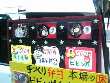 ☆ここ、日本橋界隈は当局のご指導にも負けずお昼時は、車道、歩道などに車、リヤカーなどで お弁当を売っている 屋台のお店がかなり出ています。゚*+。。+*゚゚*+。。+*゚-- ☆今日のランチ☆ --移動販売車でお弁当「カルビ丼」600円゚*+。。+*゚゚*+。。+*゚ランチを食べに行こうと思って、表に出たら、まん前に歩道に半分乗り上げて、これが止まっていました。どこのオフィスも暖房が効き過ぎているのでこの、冷た~いお茶がうれしいですね。と、言っても 自然冷却?(笑私は「カルビ丼」 ご飯大盛で ちょっと冷めている スープ付きご飯大盛は無料でした。ちなみに ビビンパ はひき肉。どこから来るのか解りませんが朝、作ってここまで持って来るのですから味は・・・ こんなものじゃないですかね。ご飯が温かったのが、せめてもの救いかな。オフィスにレンジがあるのでしたら、軽くチン、した方が良いかも。上下同じぐらいの温かさになります。☆今年、秋口の大手町 ネオ屋台村この中にある 「GRILL TOKYO」 のローストビーフ & ローストチキン のお弁当が最高に美味しいです。見かけたらぜひ!どうぞ。今日のランチ代 5000円ぐらいでした。ハッハハ いつものように 9人分。☆私の目印の画像 (Beer) が出ていないとメールが あったのですが、 そう言えば、私のお友達のブロガーさんの 画像も 「NO PRINT」 写真が掲載されていません。 になっています。 どうも楽〇はダメですね~ 過去のブログは飛ぶは、写真も飛ぶは、で ゚*+。。+*゚゚*+。。+*゚それではSee You LaterGood bye!By ken455o^o---「のだめ」 を見ながらの更新あまり見ていなかったような・・・息子は今日発売の「FF」に夢中です。勉強はどうしたんだ~Wii が2台あるので私の分も買ったので 息子とのネット対戦が 楽しみです。女房 Wii 貸してくれるかな~別名 ダイエット Wii 。Wiiスポーツ専用なので。(笑-o-o-