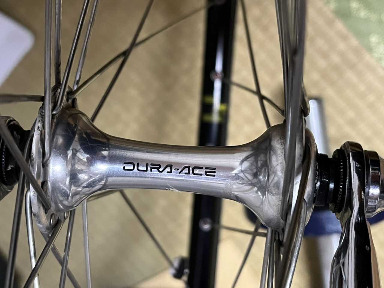ハブは、7400系なので、ポリッシュしたうえでアルマイト加工されており、30年経った今でもピカピカです。DURA-ACEのロゴは、刻印なので薄くなったり消えたりすることはありません。