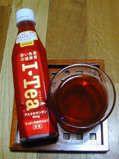 職場宛だったのですが、キリン I-Tea アイティーが当選して届きました アスタキサンチン6mg配合の「色素補給」でIT生活をリフレッシュするという新発想の6/26進発売の赤い色の健康茶です。 早速、真っ赤な色に驚きながら、冷やしてから飲んでみると…、少し不思議な味でした。香りは、紅茶、飲んでみると、ウーロン茶にジャスミン茶の味。慣れれば美味しいかも