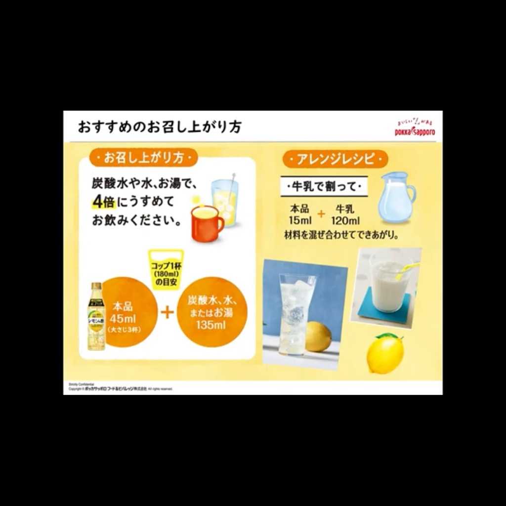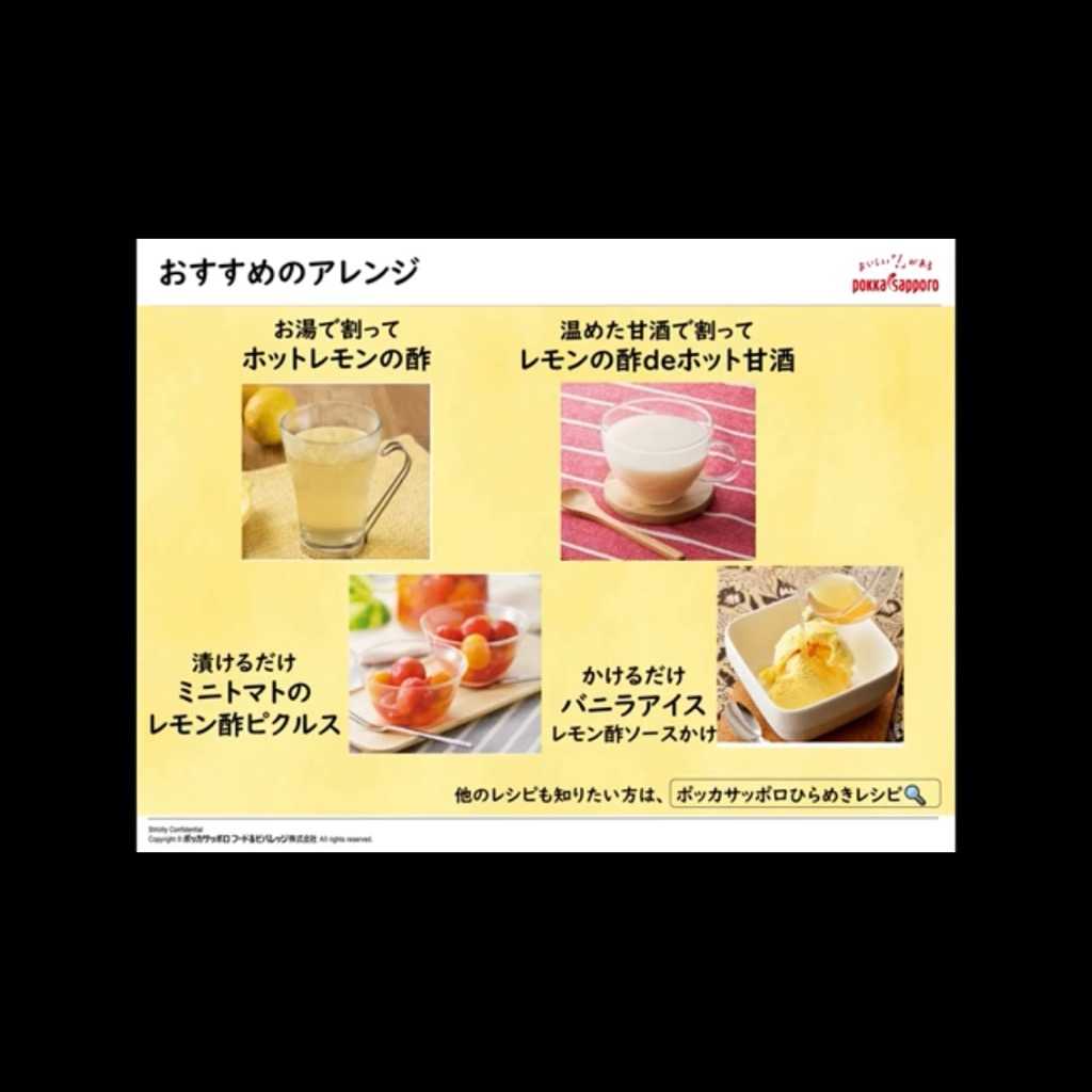 ポッカレモン は、昔からの定番!必ず冷蔵庫に常備しています。主人は、 ポッカレモン を使ってスポーツドリンクを作ってスポーツをする時に飲んでいます。