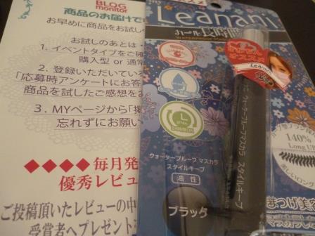 ブログモニターさんより Leanani(レアナニ) ウォータープルーフマスカラ スタイルキープのモニターをさせてもらいました。ちょうど今使っているマスカラを卒業しようと思っておりちょうど探していました。こちらの商品ざわちんさんオススメというだけあって本当にのびがイイ!ダマになったり、あまりごっつい感じにならず上品な仕上がりです。マスカラは私のメイクの中で一番こだわっているのでお気に入りが早速みつかりました。これからはこれでいきますありがとうございます。