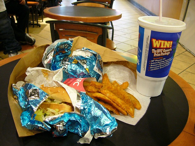 旅先について、最初の食事で失敗しました。あんまり沢山はいらないからって思ってハンバーガを食べ行きました。 日本の感覚で物頼んじゃいけないっすね。 KFCで”Buffalo KFC Snacker”ってののセットを頼みましたよ。そしたら。。。。。 ちょっと小さめのチキンバーガーが2個 ポテトLサイズ1個 でーーーーかいペプシ。(高さ20cm弱で大きさ10cm) はっきり言ってバケツです。こんなの飲みきれない・・・ これで$5ぐらい。値段的にセットだから安いんだろうけど、内容を確認せずに頼むのはよくないねぇ~。(><)日本人って、残しちゃいかんって思うから無理して食べちゃったんだよねぇ~夜ご飯もいらないやって感じ。今日からはちょっと気をつけておかないと帰るまでに何キロ体重増える事か。。。(^^;)