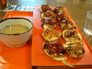 今日は地元の駅地下にある、”明石焼風たこやき”ってのを紹介します。名前に”風”がつくだけあって、普通の明石焼ではありません。明石焼って、知っての通り?ふわふわってしたたこ焼きをダシにつけて食べますよねぇ~。逆に、たこ焼きってソースに青海苔かけて、食べるのが一般的ですね。で、明石焼風たこやきは、これをミックスしてます。(さすがに、青海苔はないですけど・・・・・・・)ふわふわっと焼いたたこ焼きにソースをつけて、それをダシにつけて食べるんです。 ソースが適度にダシにとけて、最後にそのダシをグイっといくのがおいしいんです。 p.s.ちなみに、本場の明石では明石焼って言いません。 玉子焼きっていうんです。卵をたっぷり使ってるから そういうようです。