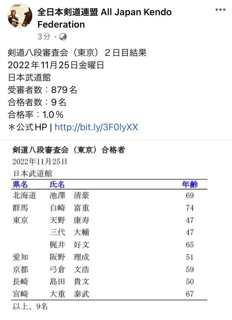 タカノサチは、またも一次も突破できませんでした。本日は、年配者合格が多かったですね。近年には無かった審査基準なのかな。。池澤先生が合格されました。素晴らしい剣道をされる整形外科医です。今回、2人の全日本医師剣道連盟からの合格者が出ましたね。4月の医師大会(新潟)盛り上がりそうですね。私も出場予定になってます。 昨日の結果も再掲します そして、第50回記念で開催された全日本医師剣道大会(京都)年代別個人戦の結果です。8年前ですね。宮坂先生、池澤先生が試合も強いんです。そして今回お二人が合格。私と大岩他、下の年代はまだまだのようです( ; ; )良い先輩のお手本がありますから、まだまだ頑張れます。体育学部を出てる人が最初は強いんです。警察特練が剣道界をリードしていきます。しかし、年齢を重ねるにつれてみーんなにチャンスは来るみたいですね。素晴らしい伝統文化の競技だと、つくづく思います。
