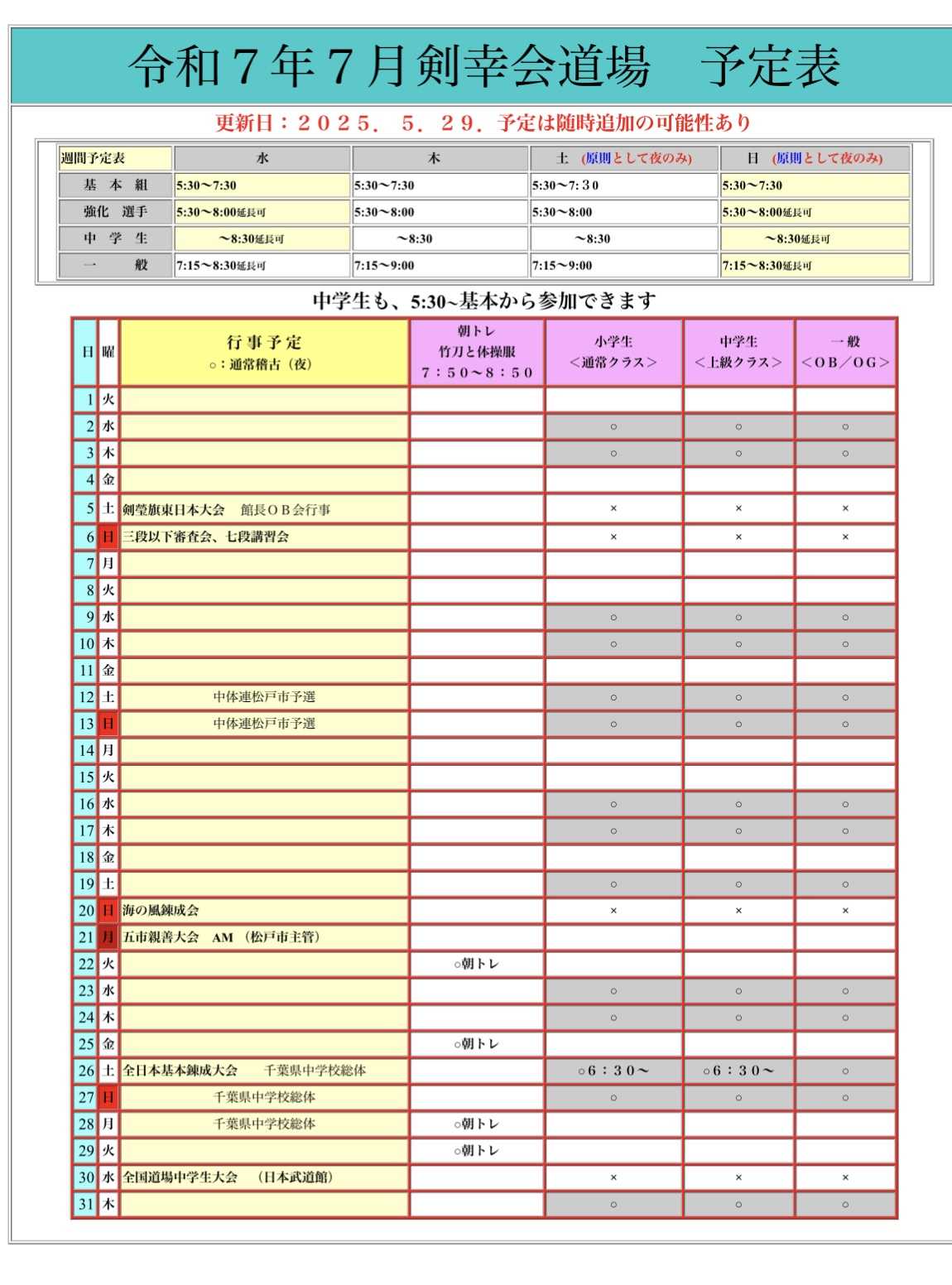 本日は船橋近隣大会に中学生が学校から出場の予定剣幸会の現時点での予定を掲載します夏休み中、例年通り、朝トレを含め出稽古歓迎します(代表者に出稽古の許可をとってからご参加ください)8月は日曜日のお休みが多いので注意(3日,10日,24日)家族行事は、この稽古休みの日を上手にお使いください9月第1週日曜日は、紬錬成会に参加します剣幸会と松戸市チーム 低学年と高学年2チームずつエントリー予定です中学生も剣幸会1チーム参加できればと思います