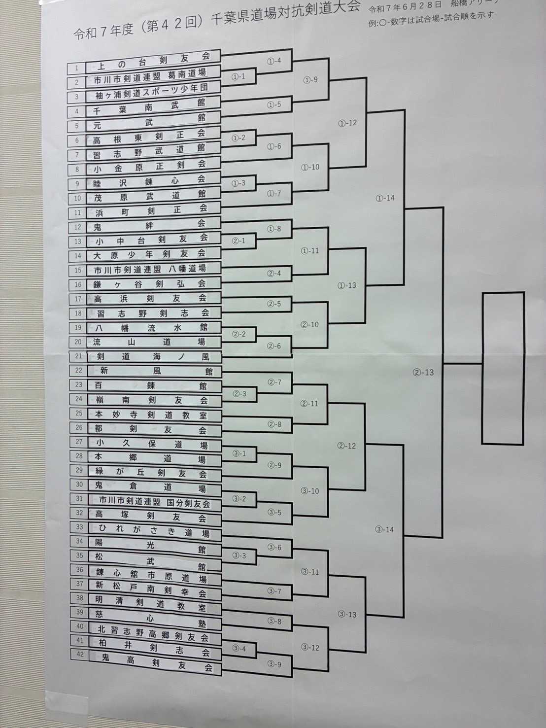 船橋アリーナ組み合わせ抽選の結果 経過は後ほど私は、留守番で医院で仕事してます🫡山と思われた、市原錬心館に勝ちましたが、ベスト8掛けにおいて、道場がお隣の「ひれがさき」さんに負けたって😭残念でしたぁ〜第42回 千葉県道場対抗剣道大会(全国予選) 上位2チームが全国大会出場優 勝 鬼高剣友会準優勝 上の台剣友会第3位 鬼絆会 新風館ベスト8 習志野武、習志野剣、本郷道場、ひれがさき