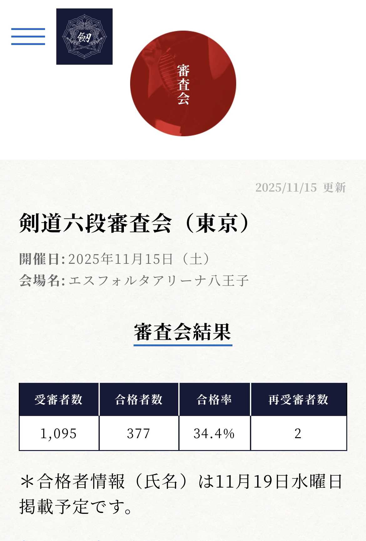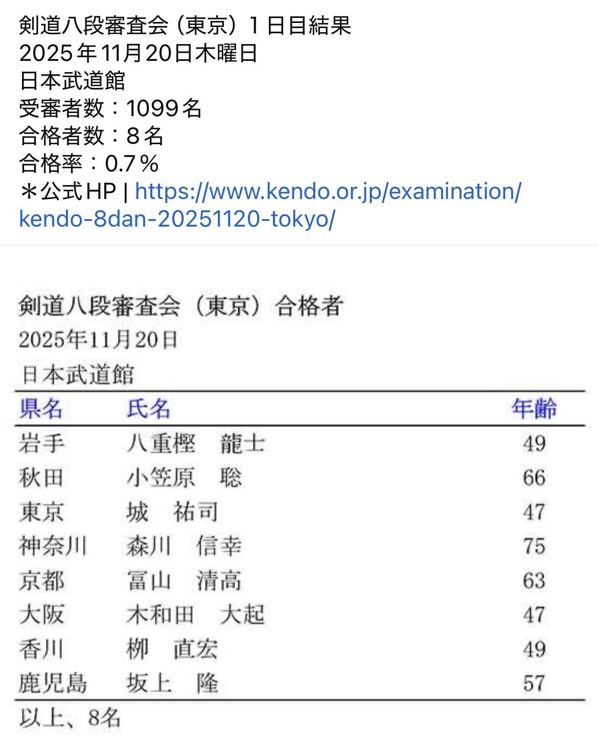 初日の結果です若手合格者が戻ってきましたね半分以上の65歳以上受審者にとっては、1/250 くらい?の2人合格という、かなり厳しい状況でしたねー 今日は、2日目になります自分は、本日受審🫡今年の自分の審査は一年を通して過去最低だと思います。今日は、落ち着いてできましたが、段位に見合う打ちは無かったと思います。受験資格が緩和され、受審者が多くなりました予想通り一次審査が厳しいですね40人中、一次合格ゼロの会場と、沢山受かる会場があるのは運かもね。2年間一次審査不合格となり、ヤバいですーそれなりの見合う稽古はしないとねぇ💦次は5/2に京都で受けます🫡前泊の宿は取りましたから👌今日の審査結果が発表されましたー