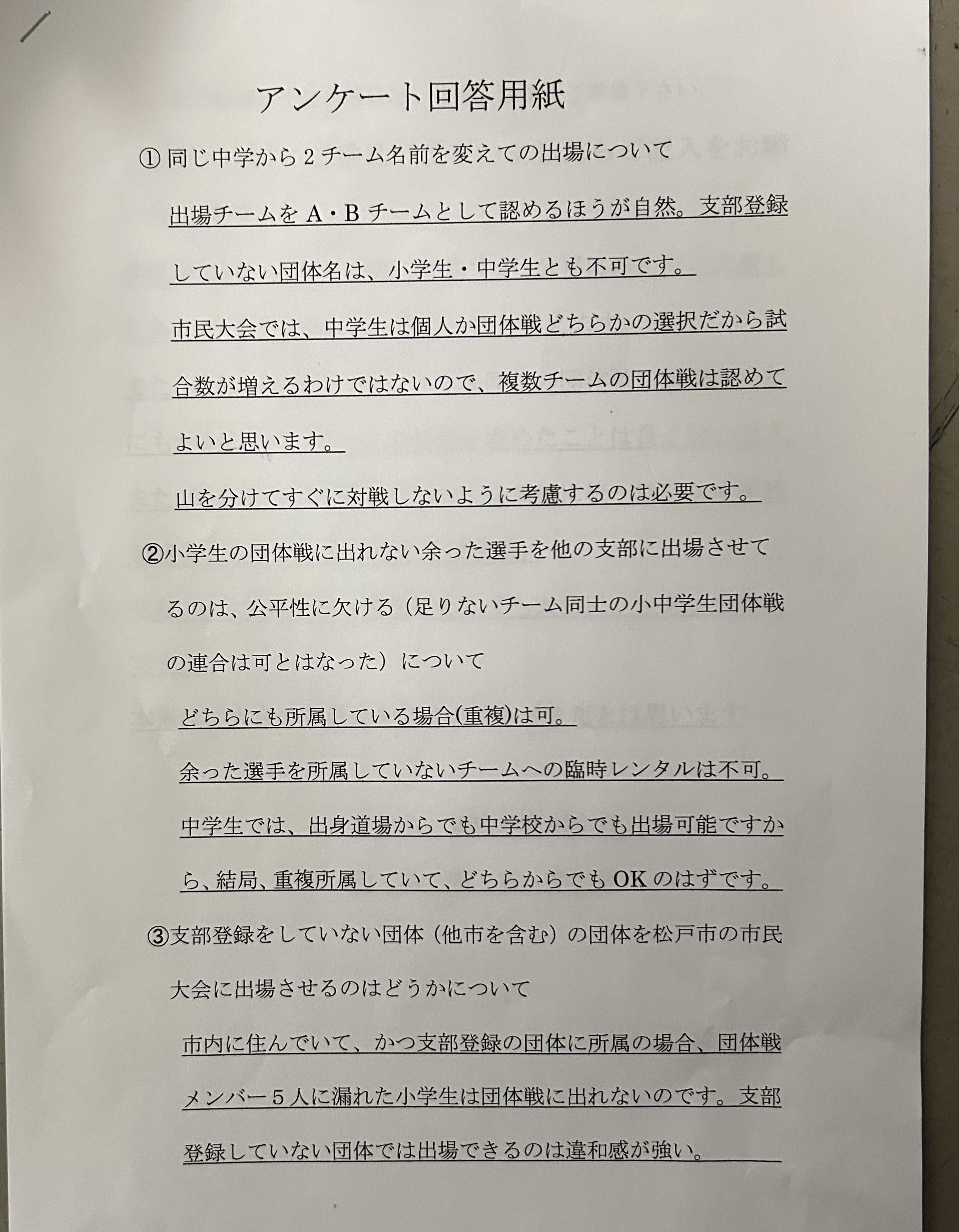 役員・理事・各支部(代表者)あてにメールが届き本日が返信期日となりました私の意見をまとめて先日提出しました内容は,以下のとおりです。自由記載の部分は、今回掲載しませんが、3問のアンケートの部分をアップ致します皆さんはどんな感想なんでしょうね? 小学生・中学生の団体戦は、各支部1チームはずっと昔からのルールですが、、剣幸会の発足初期、所属会員が多かったので、複数チームのエントリーを理事会に提案しましたが、完全否決となり、1チームしか不可と決定したこともありました。中学生になると、学校から出場を実質のAチーム、道場からをBチームにしたりしてました。小学生は、5人以外の子は、団体戦に出場できないのです。今回もやりましたが、春に出てない子を秋の団体戦に出したりして、メンバーを交換して出場してます。
