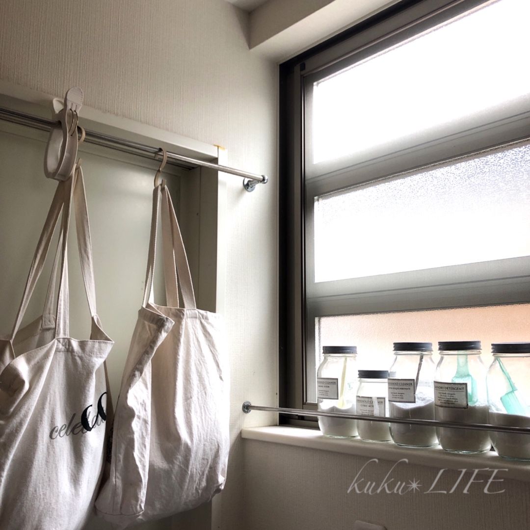 洗剤は ビンに入れて窓際に収納みせる収納ね。重曹・クエン酸・アルカリウォッシュ・洗剤アルカリウォッシュは 我が家に欠かせないもの!生理のときの経血の付いた衣類をつけおくと サラッと血液がとれるのでイライラすることもなくて 便利。ビンは 同じ種類のものを並べれば 統一感がでる! #瓶収納#洗濯洗剤#血液洗濯