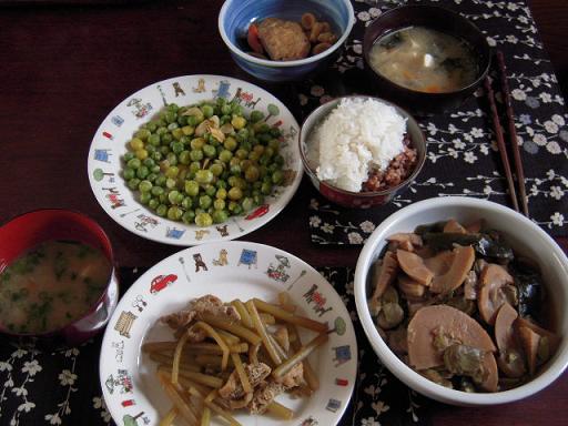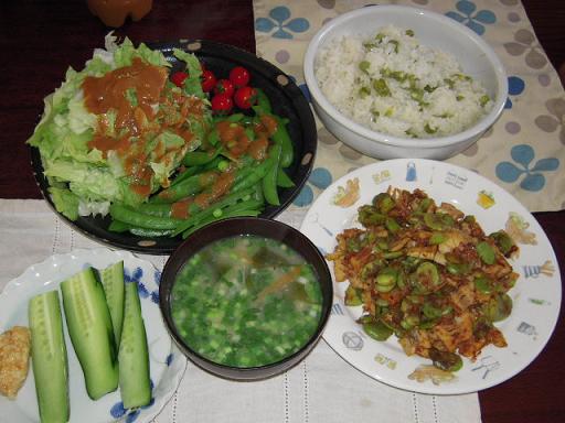 ↑お昼ごはん(ふきと油揚げの炒め煮・そら豆と竹の子の煮物・ビースのにんにく炒め・がんもどきの煮物・玄米小豆ご飯と麦ご飯ミックス・味噌汁)今日は朝からまじめに事務所で仕事。猛スピードで溜まった仕事こなしてました。旦那が急に、今日は急用ができたから11時過ぎにご飯作ってくれと11時前に言ってきて慌てて作ったのでした。と言っても、竹の子の煮物は以前作って冷凍してたものだし、がんもどきは前夜の残りです。そのうえ、グリーンピースはコウキチさんが下湯でしてくれて持ってきてくれてたばかりのものです。お陰で大助かり~♪↑なんでも美味しい種類の豆だとかほんとに、ほっこり甘くて美味しかったです。↑晩御飯野菜のチヂミ・ピーマンとちりめんのきんぴら・ワカメご飯おにぎり旦那はこれに日曜市で買ったサザエと昼のふきの残りプラスです。野菜チヂミ♪おいしい~♪日曜市で美味しそうなニラ発見!柔らかくて、焼くと凄く甘くなります。太めで、焼けたらとろっととろけました~。↑わけ分からない息子・・・夜中、息子見に行ったら「ギョっ!」なんじゃこりゃ~。お腹に薄い夏布団入れ込んで寝てる(苦笑)最近寝る時暑いとうるさい息子・・これで涼しいのか?