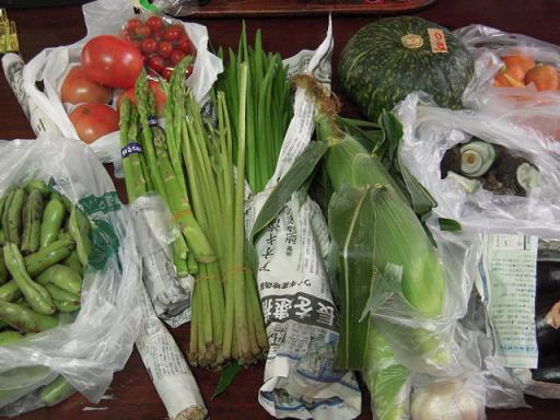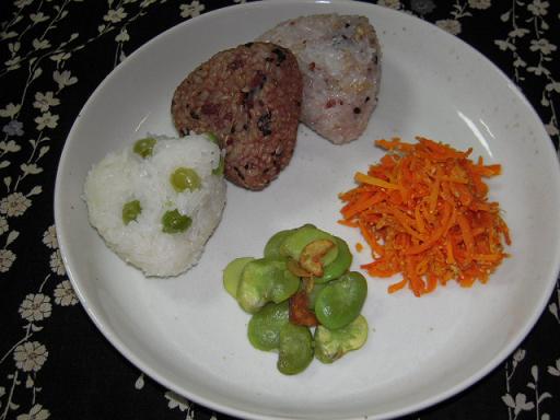 ↑昨日の夜セミナーで出した軽食です。玄米小豆ご飯・豆ご飯・玄米雑穀(鮭入り)・そら豆のガーリック炒め・人参の塩きんぴら画像撮ってないけど、後はお味噌汁・きゅうりの味噌ディップ?デザートは黒豆ガトーショコラ・チョコチップバナナシフォン・メープルクッキーです。相変わらず、デザートの比重が大きい私社長が聞いたら怒られそう~(食事道に反する!って)参加費は全てで300円にしました。いつもは参加費200円+食事代なんだけど・・今回、手間かかったわりに見栄えしないご飯だし(苦笑)で、お安くしました。実はもう一品、「グリーンピースのスープ」も作ったけど、人に出していいか美妙な味だったのでやめました。。デザートも美味しいと大好評でした~。時間あれば、おからクッキーとかぼちゃぷりんも作りたかった。。食べたいのも欲張りな私だけど、食べさせたい欲張りでもあります。↑数日前にコウキチさんから頂いた野菜です♪豆類はすでに制覇してないです~。こんなの見ると、いつか畑したいな~って思います。↑これも数日前の昼食最近毎日のように食べてるメニュー↑フライビーンズもうやめられない止らない~♪です。ちょっと固め(茹でてもパサついてるとか)のそら豆の消費にはナイスですよ~。茹でたそら豆の皮を摂り、素揚げにして塩を振ってたべるだけ。かりっとふんわり、サクサクのお菓子みたいな食感のもあり、挙げたては最高です♪ビールの飲む人ならおつまみにいいでしょうね。↑1週間くらい前にした焼肉(焼き野菜)肉は一人2枚か3枚。。←そんだけ~って言われそう。それも冷凍庫に眠ってた実家からもらった肉です。かわいそうだからソーセージは1袋使ったけどね。ほとんど野菜なので焼肉とは言えないかも。タレは手作りです。タレに添加物がかなりあるし、無添加は500円くらいと高いし。手作りしたら味も自由に調整できるからオススメです。何より簡単で美味しいよ