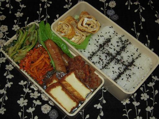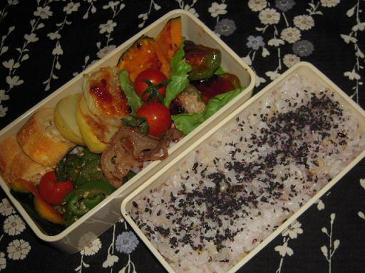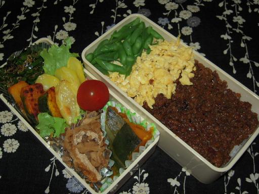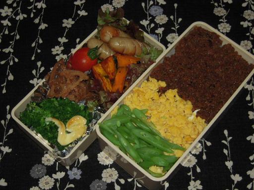 ↑娘のお弁当三色そぼろ(肉は半分、半分はグルテンバーガー)・蓮根のきんぴら・かぼちゃソテー・ブロッコリーのマヨ焼き・自然派ソーセージ・プチトマト土曜日に卓球の試合があった娘のお弁当です。やっと1勝したとか(苦笑)リクエストでそぼろ作りましたが、半分はグルテンバーガー(大豆ミンチにした感じのもの)と子供達の嫌いな椎茸もみじん切りにして入れました。その日は早朝からお弁当作り、その後は日曜のフリマの準備。午後~夜はバイトでした。日曜は4時半に起きて旦那と息子のお弁当作り、でき次第日曜市へ。↑お弁当と言っても超簡単~。キャベツの千切りのソテーと、小松菜のソテー(下湯でして冷凍してたもの使った)してご飯にのせて、昨日のそぼろのせました。男チームはつりです。私は5時半過ぎに日曜市で物色して、7時前には帰宅。買ったもの整理し、8時半過ぎにフリマに出発。フリマは11時半過ぎに早めに撤収して、家に荷物置いて講師迎えに駅に行きました。今回は阿波市の市場町のお宅でプチ健康セミナー開きました。駅からだと1時間近くかるかな。そこはお客様のお母様のお家でした。そのお母さん、胃酸過多でお薬毎日飲んでないと眠れなかったそうだけど、玄米酵素で薬なくてもすっきり朝まで寝られるようになったそうです。最初は1回1袋で試して、最近は2.2.3と、1日7袋。増やした途端に調子が良かったみたいです。とーーっても元気でパワフルなお母さん♪林賀講師の話、凄く凄く喜んでくれました!分かりやすくて、とても勉強になったと大喜び♪こんなに喜んでもらえたら、行った甲斐があったというものです。ご近所の方もいっぱい質問されてて、とても内容の濃い会ができました。こじんまりした方が、皆さん色々聞けてよいみたいですね。さて、3時間くらいは居たかな・・その後駅まで送り(講師は次は鳥取だとか)、帰宅して簡単なご飯してほっと一息でした。男チーム、今回はきすが4匹のみ。また干物用にしました。↑月曜日の夕食きすの一夜干し・野菜のオーブンチーズ焼き・インゲンの煮物・ピーマンのちりめん炒め・サラダ・麦入りご飯↑一夜干し、美味しいわ~♪↑大好きな料理です。スライスしたトマト・ジャガイモ・玉ねぎを交互に何層にも並べ(途中、塩コショウ)上によつ葉チーズのせて、オーブンで25~30分焼くだけ。味付けは塩と胡椒だけ、野菜から水分がでて美味しいスープも下にたまっています。チーズはこげちゃうので、アルミホイルかぶせるか、途中からチーズのせたりします。我が家の簡単、人気メニューです♪
